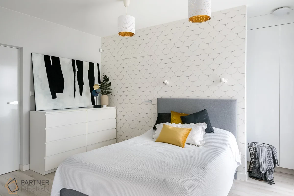 Do sypialni przy aranżacji małego mieszkania sprawdzą się łóżka z pojemnikiem lub wysuwanymi szufladami. Jeśli takich nie chcesz, to i tak pod sypialnianym meblem zmieścisz np. deskę do prasowania czy walizki. Długa narzuta powinna dobrze ukryć taką domową skrytkę.