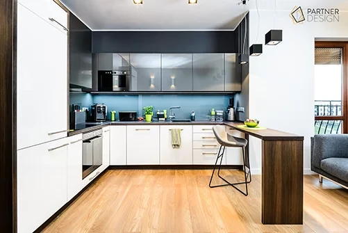 Wydzielenie strefy kuchennej szafkami to kolejne funkcjonalne rozwiązanie, które warto zastosować w mieszkaniu z aneksem. Rozwiązanie to okaże się trafionym wyborem, gdy potrzebujemy więcej miejsca na przedmioty kuchenne. Barek sprawdzi się bowiem doskonale w mieszkaniu młodej pary, lecz przy większej rodzinie może on już nie być tak praktyczny. I choć szafki będą w tym przypadku najlepszym wyjściem z sytuacji, to nie zjemy już przy nich szybkiego śniadania, chyba że zdecydujemy się na szafki z przedłużonym blatem po jednej stronie, jak na poniższym zdjęciu. Takie podejście pozwala uzyskać efekt 2w1 – mamy tu więc i barek i szafki na przedmioty. Takie rozwiązanie jest jednak wymagające przestrzennie i nie sprawdzi się raczej w małym mieszkaniu.