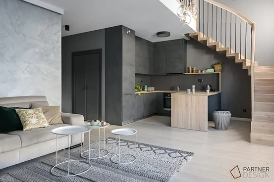 Dzisiejsze nowe mieszkania coraz częściej mają postać dwóch poziomów, zdarza się wówczas, ze aneks kuchenny umieszczany jest pod antresolą. Taki układ sprawia, że niewiele trzeba, by estetycznie i funkcjonalnie oddzielić strefę kuchenną od salonu.