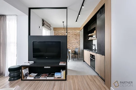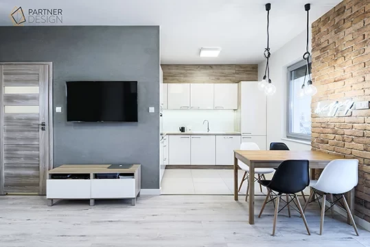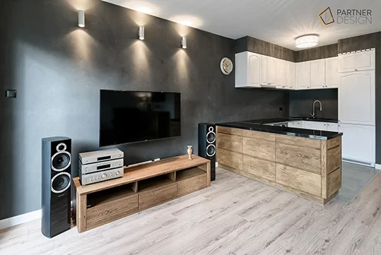 Pamiętajmy, że w mieszkaniu możemy zrobić naprawdę dużo – prawdziwym ograniczeniem bywa zwykle nasza wyobraźnia. Pomysłowym sposobem na oddzielenie kuchni od salonu przy zachowaniu ich pierwotnej przestrzenności jest postawienie granicy w postaci półki z telewizorem. Taka konstrukcja wymaga solidnego umocowania, które może i powinno stać się ciekawym elementem wystroju.