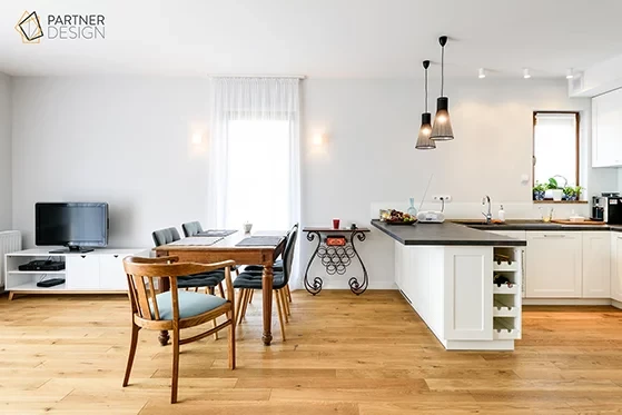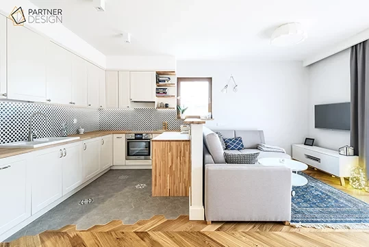 Sprawdzonym sposobem aranżacji kuchni otwartej na salon jest przegroda. Dobrze opracowana może spełnić w mieszkaniu kilka funkcji jednocześnie. I tak w pierwszej kolejności stanowić będzie linię podziału, która może być zarazem półką oraz ciekawym elementem wystroju domu. Podłoga również może okazać się polem dla naszej kreatywności. Jednym z najbardziej aktualnych trendów są obecnie nieoczywiste połącznia materiałów. Trend ten umiejętnie zastosowany w przypadku podłogi pomoże nam wyraźnie, a zarazem stylowo oddzielić kuchnię od reszty mieszkania.