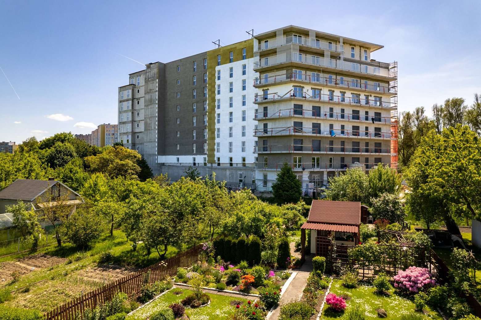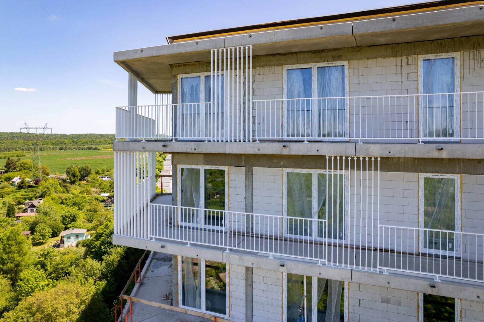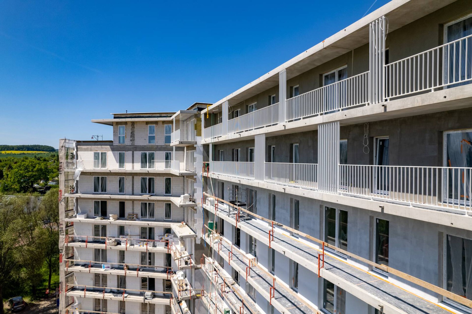 Wstawiona została pełna stolarka okienna, w budynku zastosowano nowoczesne okna pięciokomorowe, 3-szybowe PVC. Prócz samej elewacji i jej ozdobnych elementów w postaci lameli, przystąpiliśmy do montażu pierwszych balustrad balkonów mieszkań. Nowoczesna i ponadczasowa architektura budynku stała się wyróżnikiem całej inwestycji, a wysoki standard wykończenia i wykorzystanie materiałów wysokiej jakości zagwarantują satysfakcję z codziennego życia w tym miejscu.