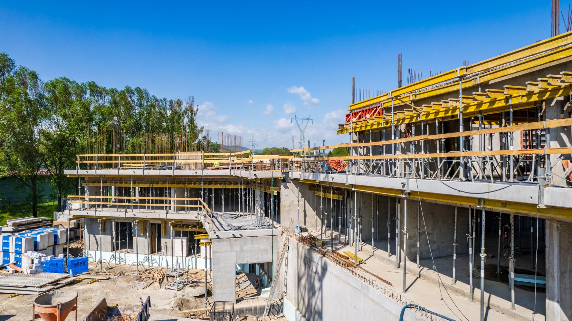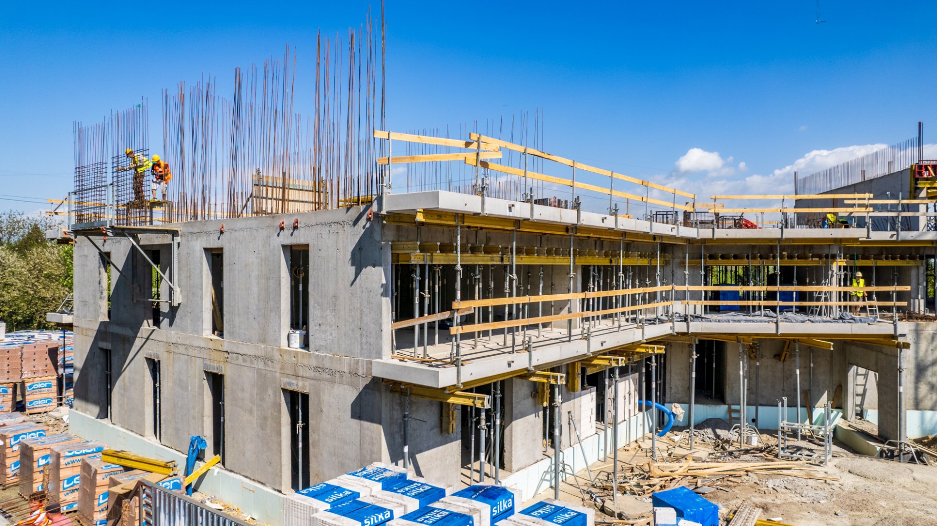 Aktualnie wykonanych jest 100% murów konstrukcyjnych oraz 50% ścian akustycznych z pustaków ceramicznych Thermopor na poziomie 1 piętra. We wszystkich zabetonowanych stropach wykonane są peszle pod instalacje elektryczne. Na poziome 2 piętra wykonanych jest 80% ścian żelbetowych oraz zabetonowane jest 50% stropu nad 2 piętrem. W klatce B prowadzone są roboty zbrojarskie ścian 3 piętra.