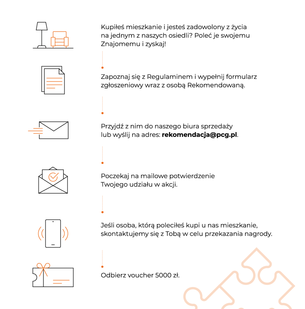 - Nagroda dla Ciebie: Za każde polecenie nowego mieszkańca, który sfinalizuje zakup, otrzymasz od nas voucher o wartości 5000 zł do sklepu ze sprzętem RTV i AGD. Dzięki temu będziesz mógł wyposażyć swoje mieszkanie w najwyższej jakości sprzęty, bez żadnych dodatkowych wydatków!